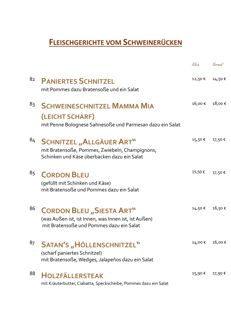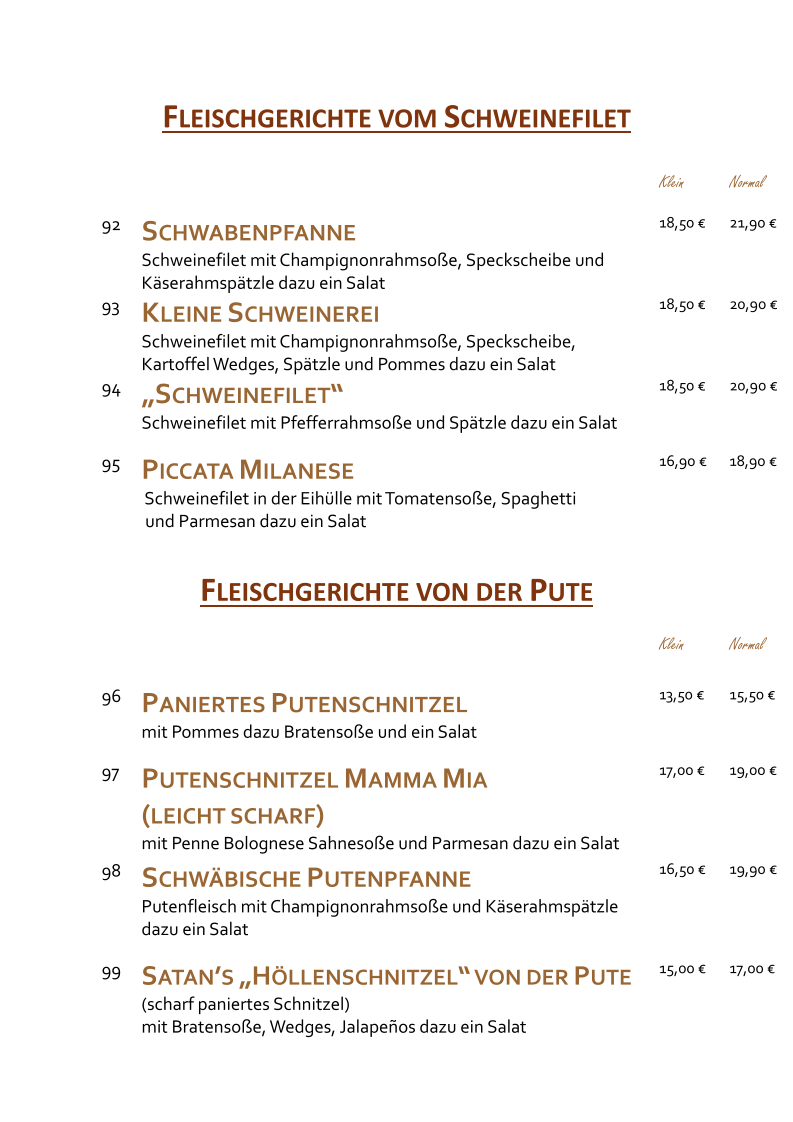 Café -Restaurant Siesta in Villingen-Schwenningen offers a vibrant Mediterranean menu that promises both comfort and flavor. The starters like the Pizzabrot Bruschetta burst with fresh tomatoes, basil, garlic, and olive oil—simple yet delicious. For poultry lovers, the range of turkey dishes is impressive: from the classic panierte Putenschnitzel served with fries and salad to the more adventurous Putenschnitzel Mamma Mia, featuring a spicy penne Bolognese cream sauce topped with Parmesan. The Schwäbische Putenpfanne combines tender turkey with mushroom cream sauce and cheesy Spätzle, showcasing authentic regional flavors. Weekend specials like the Zigeunersteak from pork or turkey add local charm. Reviews highlight the generous portions, appealing presentation, and welcoming service, making Siesta a place where Mediterranean culinary tradition meets a cozy atmosphere. Each dish feels thoughtfully crafted, inviting diners to savor both bold and subtle tastes in every bite. This spot is a true gem for anyone seeking quality and warmth in their dining experience.